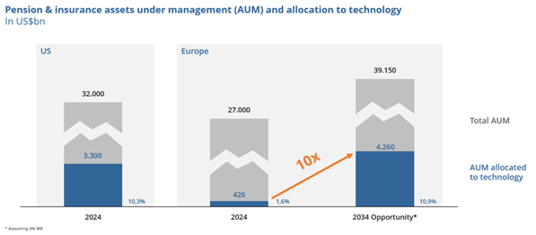 The solution lies in mobilizing Europe’s long-term private investors. Consider this: In the US the total AUM in pension funds and insurances is $32tr. 10.3% of that is invested in technology. In Europe the total AUM in pension funds and insurances is $27tr., but only 1.6% of that or $426 bn is invested in technology. Assuming the European asset base grows by 4% annually and that in ten years the share of capital going to technology grows to 10.9%, then as a result $4.3tr would be invested in technology. That is 10x the amount today.